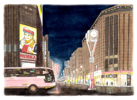 札幌すすきの交差点は、ひときわ巨大なニッカウヰスキーのヒゲおじさんが名物。まずこの看板を描くも、夜の街並みを描くのは初めて、暗さ明るさの加減がわからない。人通りも多く、なんだか蟻のように見える。試行錯誤の末、暗闇を描けば光が現われることを知る。下絵にPhotockのフリー写真素材をお借りした。謝意を! 2026/3/9