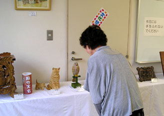 北老センター文化祭展示会の木彫コーナー/「座る猫」は一番奥に居た