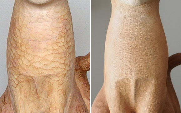 まず左の黒猫。獲物を狙ってそーっと忍び寄る姿勢だが、この猫すでに爪を出している。犬と違って、猫は忍び寄るときには音を立てないように指~肉球の間に爪を隠している、爪を出すのは獲物を捕らえる瞬間だ。その習性を知らずに彫った失敗作である。修正すれば直せるが、安易だった自分の戒めのため、そのままにしてある。