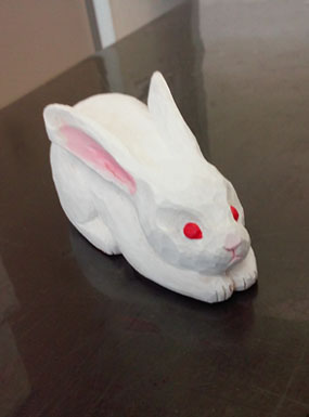 この2~3か月間に3人の会員が初めて手掛けた立体作品を紹介しよう。三角輝明作「ライオン」、小柳さつ作「ウサギ」、吉川裕子作「ネコ」。手の平に乗るほどの小さな彫刻だが、みんな気持ちを込めて彫った。動物には仕草や表情というものがあるので、完成すると木片に生命が宿った気がして、格別の愛着がわいてくるようだ。2019/6/22