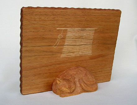 右は鏡枠の裏側に彫ったものだが、風鈴と簾の下で丸くなって寝る猫。この間違いは猫を飼っている人なら分かるに違いない。板面の陰刻の図柄から季節は真夏、ほんの少しの涼風でもほしい酷暑のさなか、猫はだらけて四肢を伸ばし、体熱を放散するポーズになるはず。丸くなって寝るのは気温の低い秋か冬だ。これもまたそこまで考えが及ばずに彫った私の失策である。