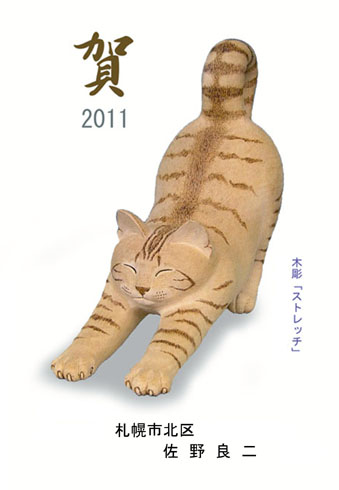 昨年、年賀状のデザインとして採り入れてみたら、意外に好評だったので、毎年彫る猫作品のなかから出来のいいのを登場させることにした。干支にネコは入らないから、逆に毎年使っても問題ないのがいい。2011/1