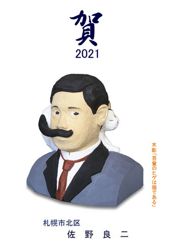 年賀状はその年の干支を図案化するのが常識のようだが、常識のない私は毎年、木彫猫を入れる。木彫をやるようになってから頑なに押し通し、いまや年賀状は作品発表の場でもある。今年は趣向を変えて「怪しい奴」にした。