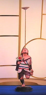作品の皿回し芸人は何時代か、着物とワラジといういでたち。鼻と唇の間(人中)に長い竹の棒を乗せ、その先端に皿を乗せている。唇をとがらすようにしてバランスをとっていて、目は高い竹の先の皿を見守っている。右手に日の丸の扇子、左手は大きく曲げ挙げた左足の端をつまんでいる。つまり立っているのは右足一本の片足立ちである。その緊張感のなかで、着物の襟が大きくずれて肩が見えそうだし、帯は斜め、着物の裾は尻端折りしている様子から、おかしみも漂ってくる。竹の棒のしなり具合も絶妙だ。