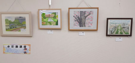 北老人福祉センターの文化祭展示が11月5日から2日間開かれ、趣味のサークルの会員作品や、水彩画・絵手紙・書道・皮革工芸・木彫・俳句など講座の作品が公開された。私も水彩画講座の受講生の仲間たちの作品とともに、「札幌大通り公園」(下・右端)を出展した。画歴半年ほどの私たちは、まだ初心者の域を出ていないかもしれないが、同じ風景を描いても様々な個性が表れていて楽しい。(2018/11/5)