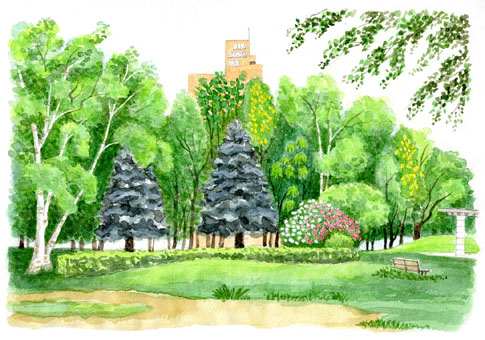 水彩画講座を受講して間もなく、北老人福祉センターの教室から何気なく窓の外を眺めたら、いろいろな木々が彩り鮮やかに若葉を競っていた。こんな身近にいい景色!とスマホで撮った。しかし、写真にして見ると樹種が多すぎ、習い始めの私にはとても描き分けられそうになかった。あれから半年、現状の力試しとして描いてみた。広葉樹は多少要領を得たように思うが、針葉樹は描き方に迷い、うまく表現できなかった。(2024/10/5)