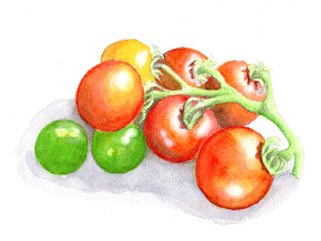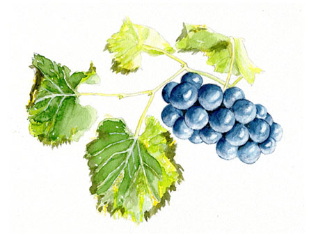トマトは赤でも橙でもない、2色の混ぜ加減に工夫が要る。試し塗りしてから描いてみたが、なかなかそれらしい色合いにならなくて、何度か重ね塗りしたので濁ってしまい、美味そうには見えない。ブドウはブルー1色で描く。濃淡の加減だけだったので意外に容易にできた。粉を吹くような感じまでは出せなかったけど、こっちは少し美味そうに見えるのでは?(2024/5/23)