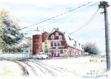 野外スケッチでせっかく重要文化財を見学する機会を得たのだから、と札幌農学校第2農場で一番大きな建物「収穫室〜穀物庫」を描く。歴史を物語るような大木に囲まれているが、私には樹種別に描き分けることなど無理なので、ほとんど筆任せて色を塗りたくった。建物をチマチマ描くのは楽しめたものの、A4の画用紙では小さすぎて細部までは小筆でも描けなかった。偶然に写った老夫婦らしい姿はありがたく入れさせてもらい、ちょっぴりほのぼの。(2024/6/28))