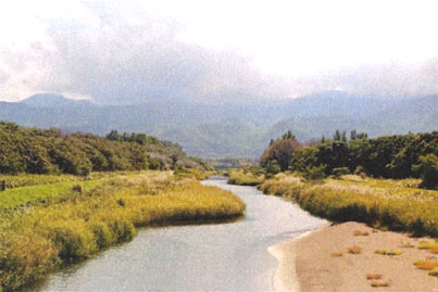 ●「星置川から手稲山を望む」 茅を点描、砂州は滲み