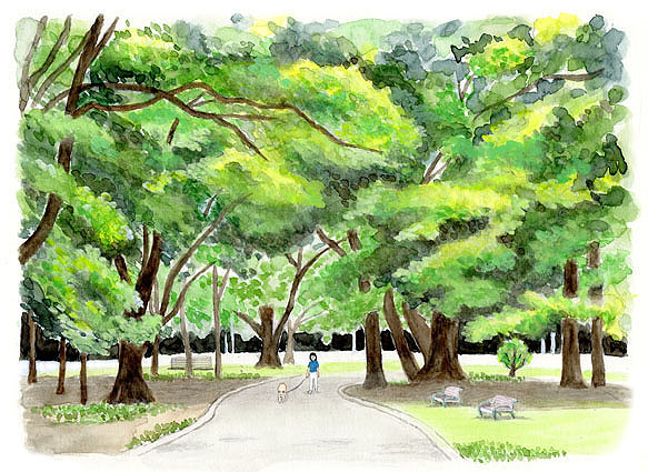 私が最初に選んだのは下の写真、末広がりの道路なので奥行き感が出せそう、と思ったのだが、大木の枝が複雑にからみ合って描けそうにない。初回は若葉の繁る木を描きたかったので、構図だけいただき季節を夏に塗りかえた。だが水加減も色加減もわからず、イラストに色を塗ったような、水彩画といえそうもないものになってしまった。TVの“プレバト”なら凡人か才能なしというところか。(2024/4/5)