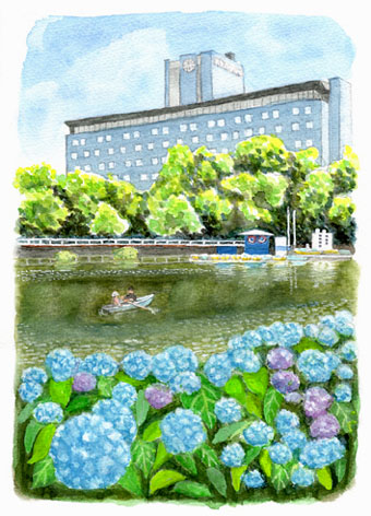 思いついたのが、縦長に構成し直し、奥行きのある構図にすることだった。水面の映り込みが難しいのにボートに乗る人を入れ、きれいに咲いたアジサイはデフォルメして遠近感を強調……結果、構図はいいはずなのに、どうも描く力が伴わなかったようだ。(2024/7/28)