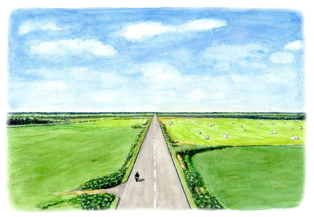 猿払村道エサヌカ線の一本道。ただ真っ直ぐな道路のほかは見渡す限り牧草地で、何にもないということの素晴らしさ。デッサンは直線を3〜4本引いただけでOK。彩色は草種の違いを塗り分け、晴れた空に雲を浮かばせた。最後にライダーの後ろ姿を描いたら、排気音が聞こえてくる気がした。あの地平線までアクセルをふかせ! 2025/2/7
