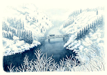 福島県を流れる只見川は鉄道ファン、撮影マニアに超人気のスポット。ググれば数多くの絶景が見られ、中でも雪景色に魅せられた。流域は積雪量がかなり多いようだが、北海道とは気温が違うせいか、どこかあたたかみがある。青(インジゴ)1色で描くも、樹氷や川辺はガッシュの白で補筆。シンプルさが爽やかな気分にさせた。2025/1/18