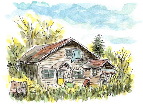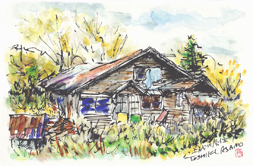 ラフな筆致を真似ていると、「もっと思いっきり」「リラックスして大胆に」と指導され、ペン先を跳ねたり転がしたり、多少ひん曲がっても汚い色になっても廃屋だからかまわないと思って、筆勢にまかせた。すると講師は私の絵を取り上げ、みんなの前に掲げて何か言った。このごろ耳が遠くなってよく聞こえなかったが、どうもハナマルらしい。だが、私のめざす水彩画は整然としたきれいな風景だ。こんな乱雑な描き方がホメられるなんて……。(2024/4/19)
