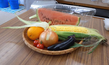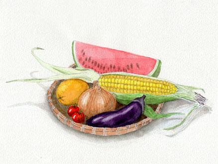 当番が朝、青果店で買ってきた旬の物がテーブルに並んだ。静物画は対象が限られるから描きやすいが、今回は複数の食材がテンコ盛り、それぞれを描き分けなければならない。講師も課題をしだいに難しくしてくる。でも、このところ空と雲・樹木・水辺など、描けない尽くしの風景に身構える日が続いたので、今日はなんだか気持ちが軽く、楽しんで描けた。それにしても野菜の高騰は庶民の嘆き、費用は大丈夫?(2024/7/19)