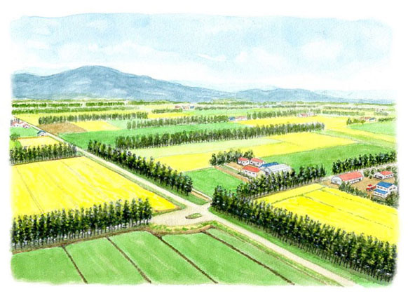 北海道の防風林は見慣れた風景だが、これは十勝平野を俯瞰する図。整然とした防風林に仕切られた農地はまるでパッチワークのように美しい。散在する農家や庭先を描くとき、自分が住んでいる気がしてきて楽しい思いに浸った。トラクターを置いてみたが、小さすぎて何だか判らなくなったけど。2025/12/8