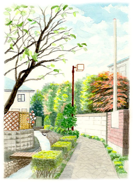 これは昨年受講中に出された題材の一つ。浅野講師が旅行の途次、横道に逸れたら瀟洒な住宅地が現われ、思わずシャッターを切ったと言っていた。晴れた日の穏やかな昼下がり、なんかほっくりする光景だ。描き終えて思いついても遅いが、曲がり角の辺りから歩いてくる人か、自転車に乗ってくる人が居たら、もっと雰囲気が出たのでないかと……。2025/5/15