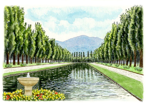 手稲山をバックに運河とポプラ並木がシンメトリーに配置された雄大な景観。観光写真ではまるで設計図のような構図がほとんどだが、会員のKさんが撮ってくれた1枚は、やや右寄りのアングルなので、木々の形や水面に微妙な変化があって面白味が出せそう、と張り切って筆をとった。結果、ポプラはどうやらそれらしく描けたと思うが、水面の光の揺らぎが難しい。遠近感は出せたが、初秋の空気感まではまだまだ……。2025/10/10