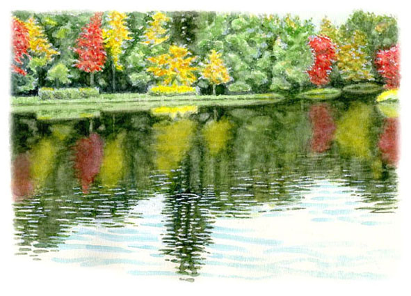 中島公園の紅葉風景。地上より水面を広くとって、木々の映り込みと光の揺らぎを表現しようと意図した。普段からこういう場面をよく観察していないから、どう描けば効果的か、頭の中に細部のストックがない。目に映る美しいと感じたものを、その都度スケッチしておかなければ、と思った。「ボーっと生きてんじゃねーよ!」とチコちゃんに叱られそう。2025/11/10