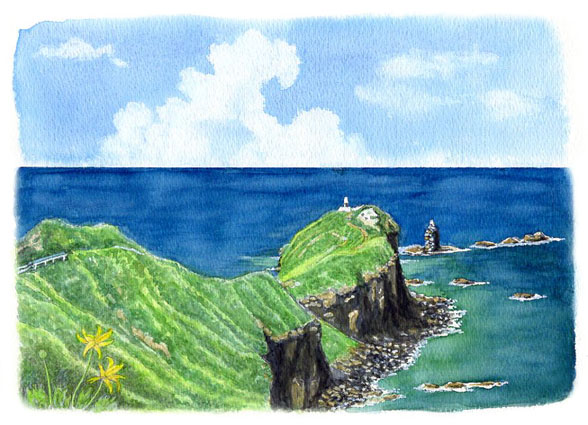 ●「積丹蒼海」入道雲とエゾカンゾウ