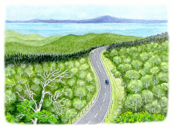 知床半島を横断し、宇登呂−知床峠−羅臼を結ぶ27kmの国道334号線は、世界自然遺産の絶景を走るドライブ・ルート。遠くに国後島あり、根室海峡を挟んで羅臼岳あり、峠周辺は風雪に晒されたハイマツやダケカンバ、エゾマツの群生林ありで、私には手に余る大パノラマ。描き直すこと4枚目、まだ納得がいかない。描いたと言いきれる日がくるのだろうか。2025/10/21