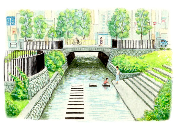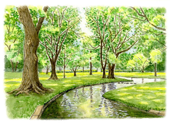 ●「初夏の公園」 木々と川の形で遠近感