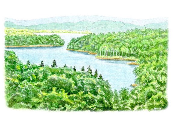 幌加内町の雨竜川上流にある朱鞠内湖。若い頃、湖畔でキャンプした思い出がある。当時は東洋一の人造湖といわれ、現在でも湛水面積は日本最大とか。だが、この絵で描くべきは水面よりも群生する木々が主になった。森の諸相をどう描くか、ランダムな自然の形がうまくつかめず、描き直すこと3回目。こんなところが自分の限界か。2025/7/8