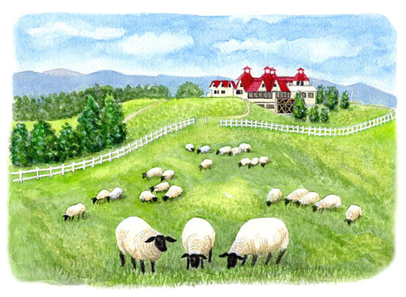 私が人生のほとんどを過ごした士別の観光地・サフォークランド“羊と雲の丘”。頂上には羊肉のレストランと羊毛グッズの店がある。風渡る緑の丘でのんびり草を食む綿羊の群れ……数枚の写真をミックスして下絵を描いたせいか、構図が何となく寄せ集めの感じになった。牧歌的風景をめざしたのにどうもメルヘンチックに見えるのはなぜだろう? 2025/4/20